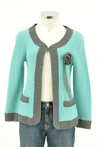 DKNY Aqua Blue Knit Long Sleeve Hook and Eye 2 Pocket Scoop Neckline with Grey Trim and Flower on Left Chest Sweater Review
