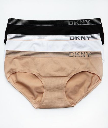 DKNY Style 570046A. Comfortable hipster panty. Seamless nylon blend. Tagless for comfort. Striped elastic logo waistband. Low, 4.5 inch rise. Each color sold separately.