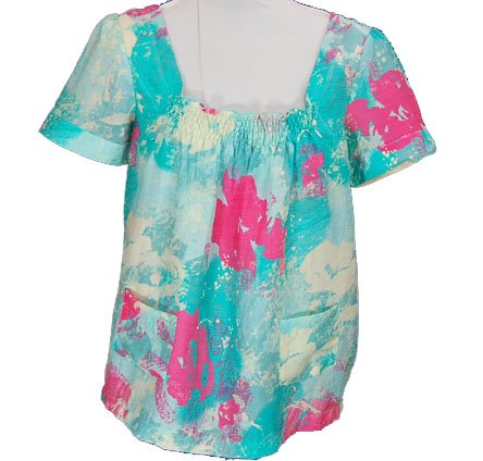Shirt features a square neck with smocking in front and back. Two pockets on front.