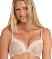 DKNY Style 458569. Seamed, underwire, contour cups. Stretch lace. Push-up pads for enhanced cleavage. Demi cups provide moderate coverage. Lightly padded cups for subtle enhancement. Non-stretch center provides additional support. Sexy point d' esprit design on cups. Delicate scalloped trim along bustline. Embossed logo on back closure. Fully adjustable stretch straps. 3 column, 2 row hook and eye back closure.